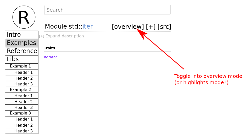 It would definitely direct people to look at certain specific things easier than now. I would imagine an "overview" mode would be site-wide until it's disabled (+/- would still work normally but hidden types wouldn't appear until it was disabled). You'd probably have to tag the types in the libs with #[doc="overview"] or favor or something to make it work well.